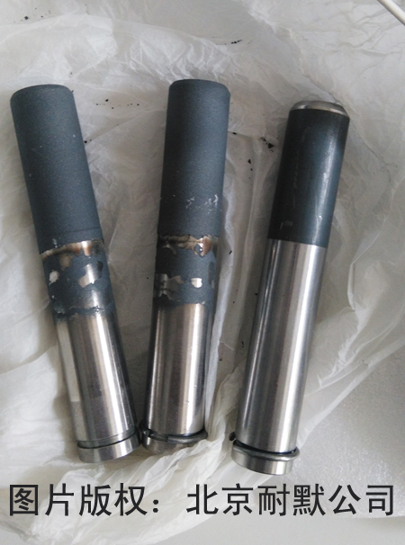 圖(2)超音速噴涂陶瓷涂層磨加后前后對比照片,左邊兩個是未磨加工,最右邊一個是磨加工后的